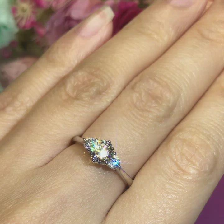 प्रेम की त्रिलॉजी: V16 V16 विंटेज तीन पत्थर सगाई की अंगूठी के साथ अपनी "भूत, वर्तमान और भविष्य" की कहानी बताएं। यह कालातीत डिज़ाइन एक केंद्रीय हीरे के साथ दो महत्वपूर्ण साइड स्टोन्स को दर्शाता है, जो आपके संबंध की शाश्वत यात्रा का प्रतीक हैं। विंटेज परंपरा में निहित, V16 इस शक्तिशाली प्रतीकवाद में प्राचीन आकर्षण की एक परत जोड़ता है।